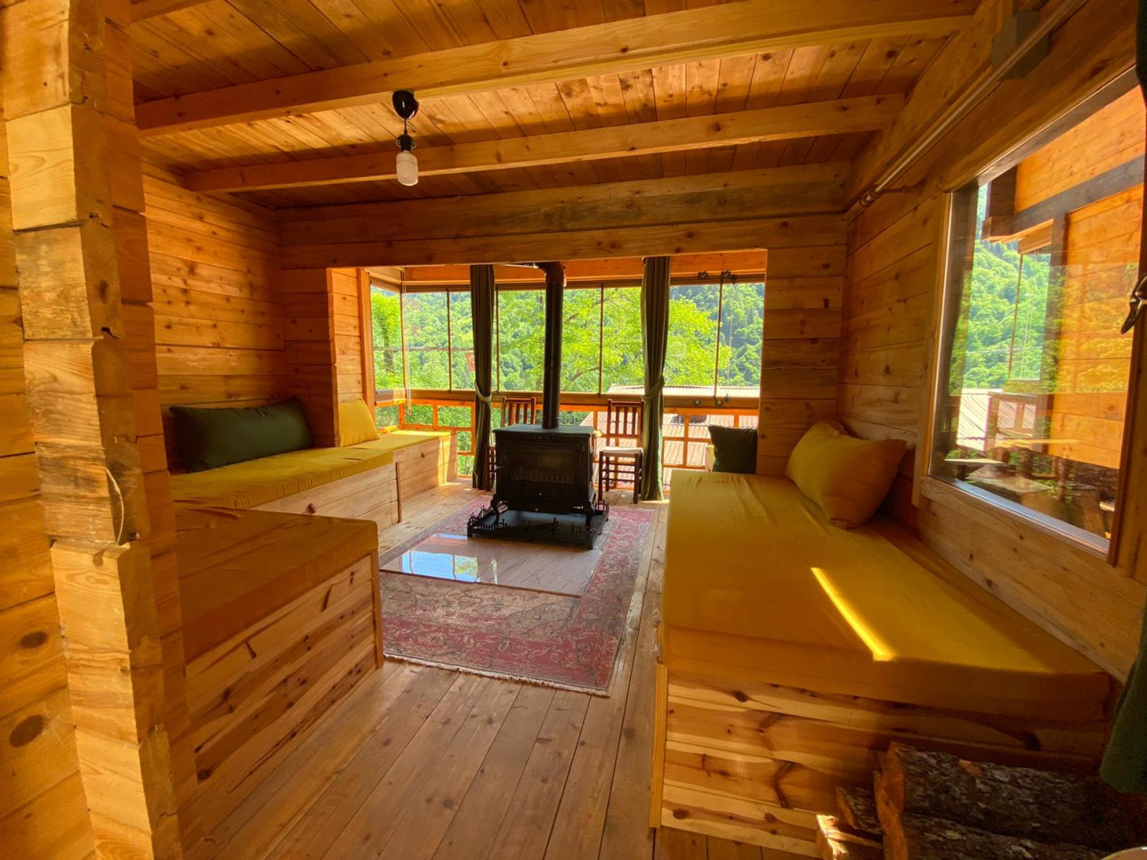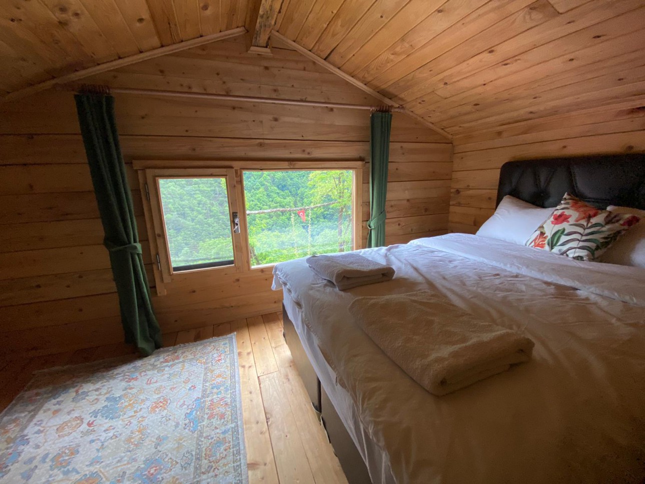 Tamamı ahşap bungalovlarımız 2 katlı, üst katında 2 odası, bir odasında çift kişilik yatak diğer odasında 2 tekli yatak, alt katında tuvalet banyo, şömineli soba ve yöreye uygun dizayn edilmiş oturma alanı vardır. Bungalovlarımızın hepsinde televizyon, minibar ve saç kurutma makinası vardır. 4 kişiliktir isteğe göre alt katında yatak hazırlanabilir.
