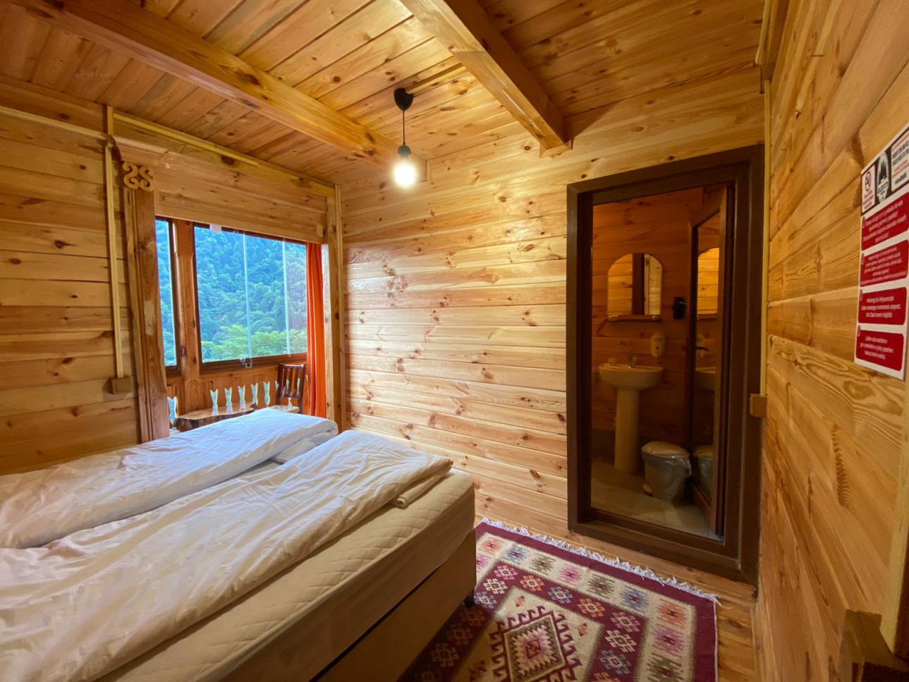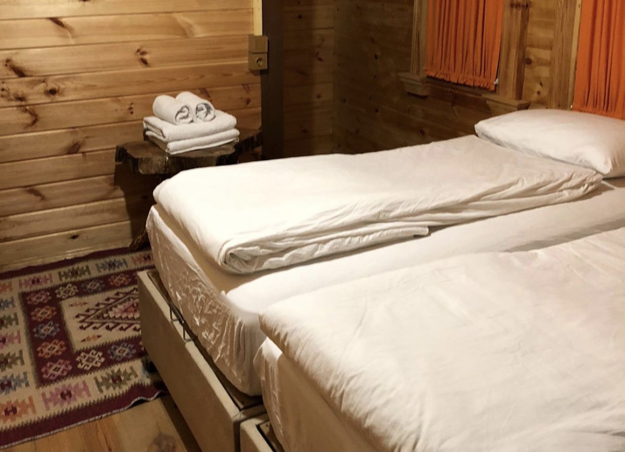 Tamamı ahşap standart odalarımızın içerisinde 2 tekli yatak, banyo tuvalet, askılık vardır. İstenildiğinde yataklar birleştirilip çift kişilik yatak da yapılabilir.